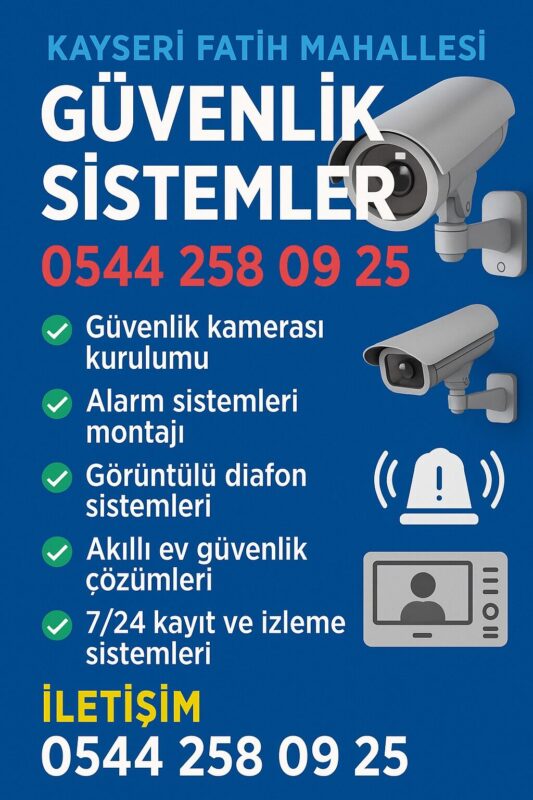Kayseri Argıncık Mahallesi’nde güvenlik sistemleri hizmeti arıyorsanız, profesyonel kurulum ve teknik destek için 0544 258 09 25 numaralı hattı arayarak en yakın uzman ekibe ulaşabilirsiniz. Ev, iş yeri, apartman ve site güvenliği için kullanılan kamera sistemleri, alarm çözümleri ve kayıt sistemlerinin doğru kurulumu güvenliğiniz açısından büyük önem taşır.
