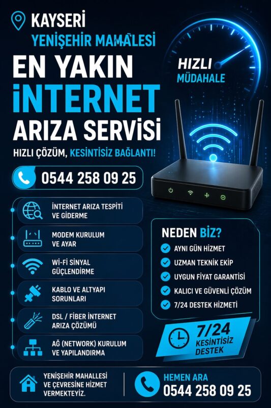 Kayseri Yenişehir Mahallesi En Yakın internet arıza servısı 0544 258 09 25 arayanlar için hızlı, güvenilir ve profesyonel çözümler sunulmaktadır. İnternet kesintileri, modem sorunları ve bağlantı problemleri günlük yaşamı ve işlerinizi aksatabilir. Bu nedenle Kayseri Yenişehir Mahallesi En Yakın internet arıza servısı 0544 258 09 25 hizmeti ile uzman ekiplerden destek almak büyük önem taşır.