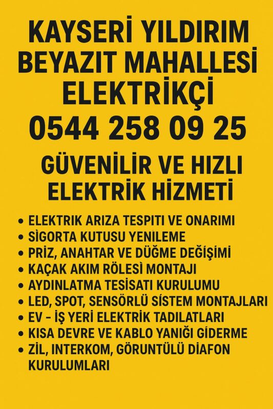 Yıldırım Beyazıt Mahallesi’nde uyducu arıyorsanız hızlı çözümler için hemen arayın: Kayseri Yıldırım Beyazıt Mahallesi Elektrikçi 0544 258 09 25
